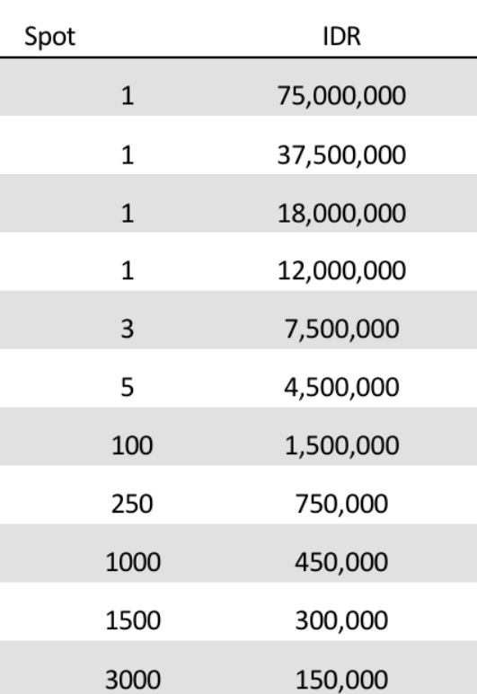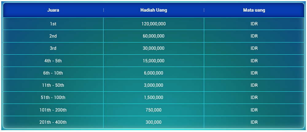 2. Total Hadiah Event ini adalah sebesar Rp 8.560.500.000 yang akan dibagikan kepada seluruh pemenang Tournamen